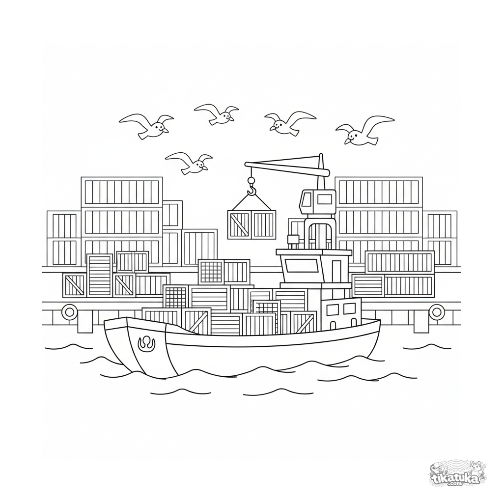 Página para colorir para pré-adolescentes 7-9: uma barcaça de carga em estilo vetorial plano é carregada em um porto industrial. Formas geométricas.