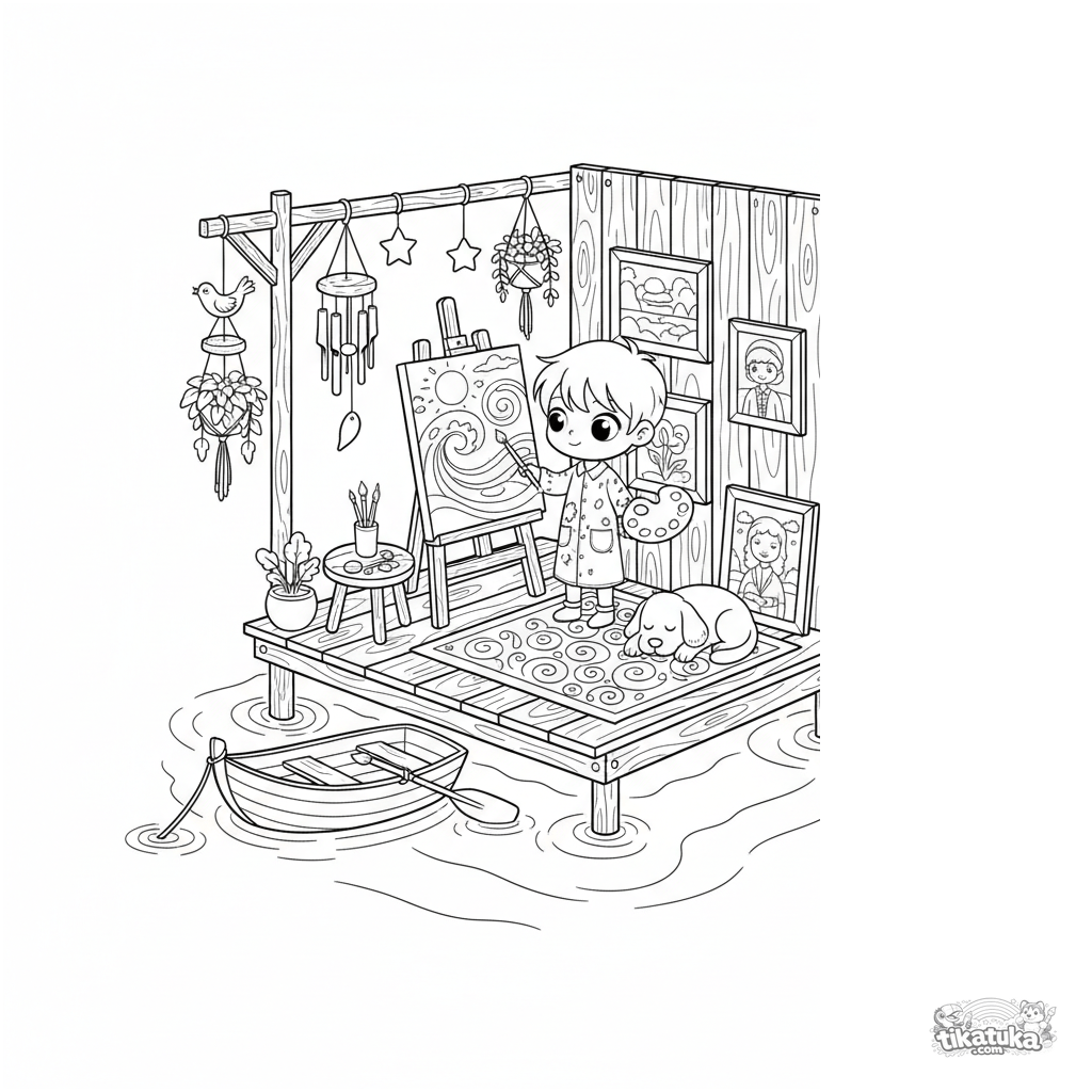 Página para colorir detalhada para crianças de 10 a 12 anos: um estúdio de artista flutuante criativo em uma plataforma de madeira. Artista no cavalete, pinturas, paleta, cachorro e uma vista marinha tranquila.