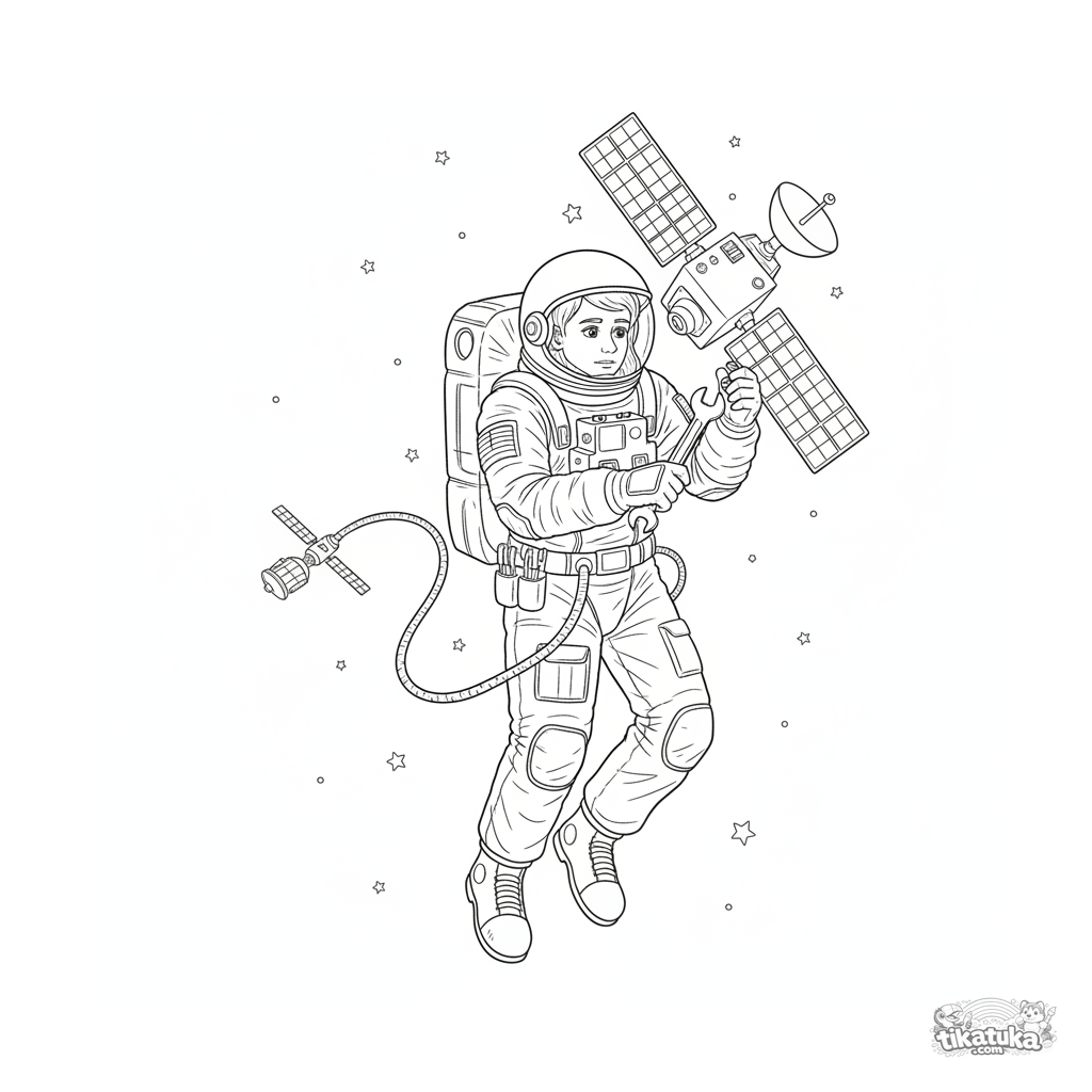 Página para colorir para 10-12 anos: um astronauta flutuando no espaço conserta um satélite entre estrelas. Traje espacial e ferramentas detalhados.