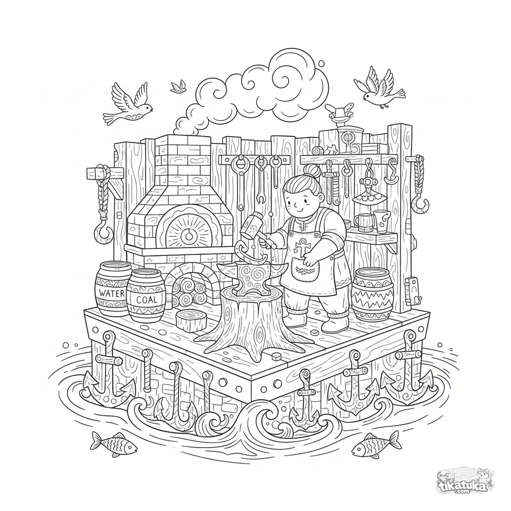 Página para colorir de uma oficina de ferreiro flutuante estilo lubok popular para 10-12 anos. Detalhes: forja, bigorna, ferreiro com martelo, ferramentas, barris.
