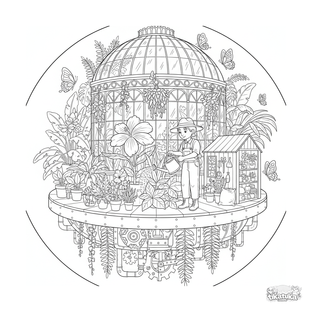 Página para colorir naturalista de uma estufa botânica flutuante para 10-12 anos. Muitos detalhes de plantas, arquitectura de vidro, jardineiro a trabalhar.