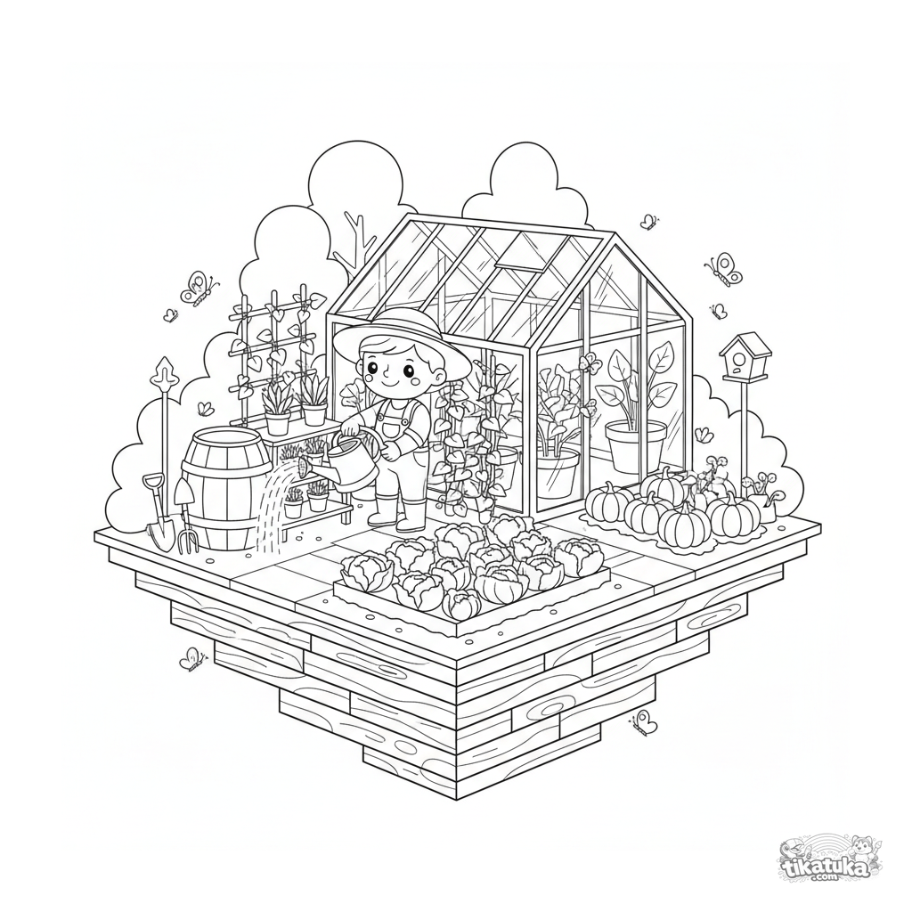 Página para colorir para 10-12 anos: um jardim flutuante com estufa e canteiros de vegetais em uma plataforma resistente no mar. Um jardineiro rega plantas, borboletas e um barril de chuva por perto.