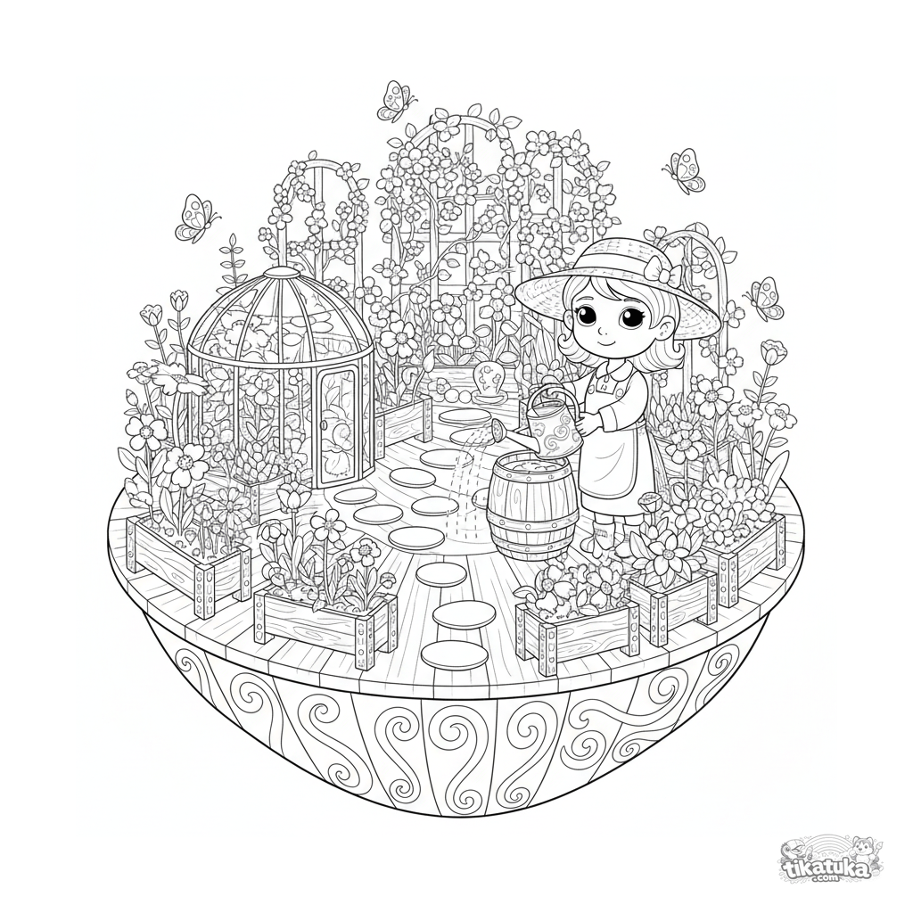 Página para colorir detalhada para crianças de 10-12 anos: arquitetura de uma plataforma de jardim marítimo flutuante com estufa, flores e um jardineiro.
