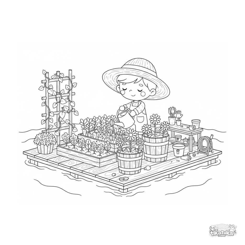 Página para colorir detalhada para crianças de 10 a 12 anos: um jardim flutuante tranquilo com canteiros elevados e flores em uma plataforma de madeira no mar. Jardineiro, treliça, ferramentas.