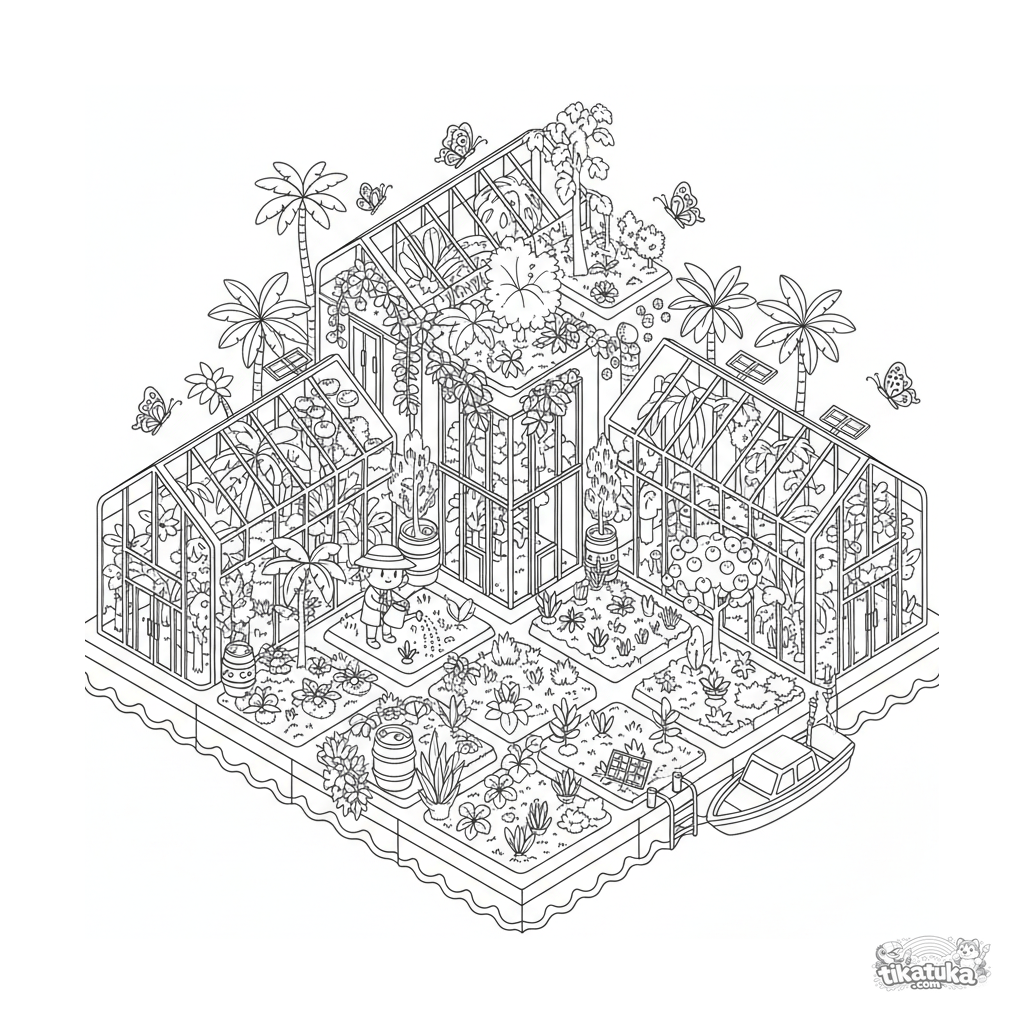 Página para colorir para 10-12 anos: uma estufa flutuante complexa com plantas exóticas em um mar tropical. Botânico, telhados de vidro, borboletas e painéis solares.