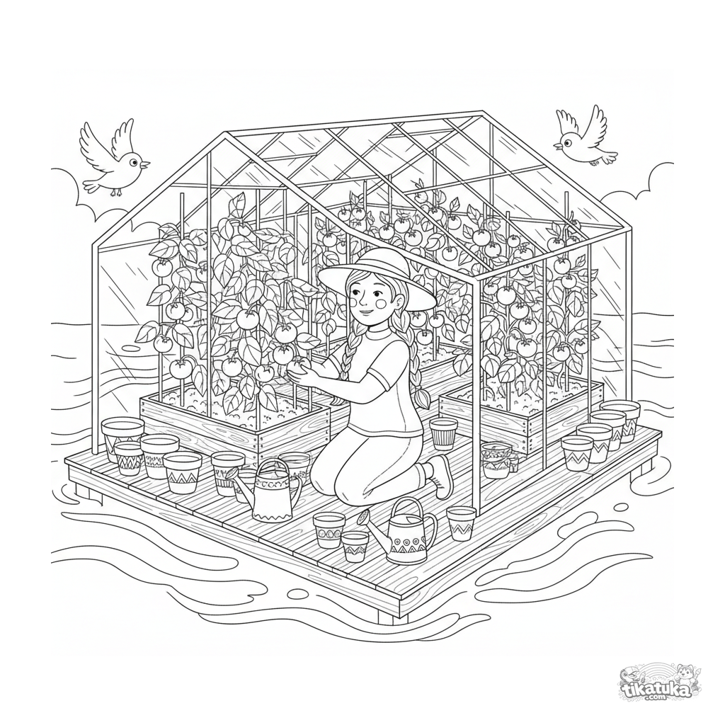 Página para colorir detalhada para 10-12 anos: um jardineiro a colher vegetais dentro de uma plataforma flutuante de estufa com canteiros elevados, paredes de vidro e vista para o mar.