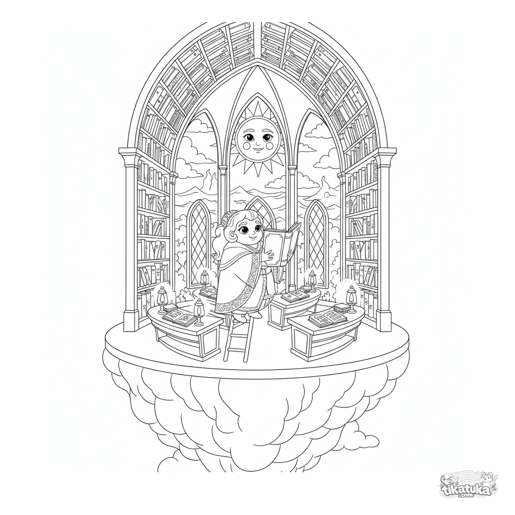 Página para colorir complexa de uma biblioteca flutuante em estilo medieval iluminado para 10-12 anos. Detalhes: estantes, escada, pergaminhos, mesas de leitura.