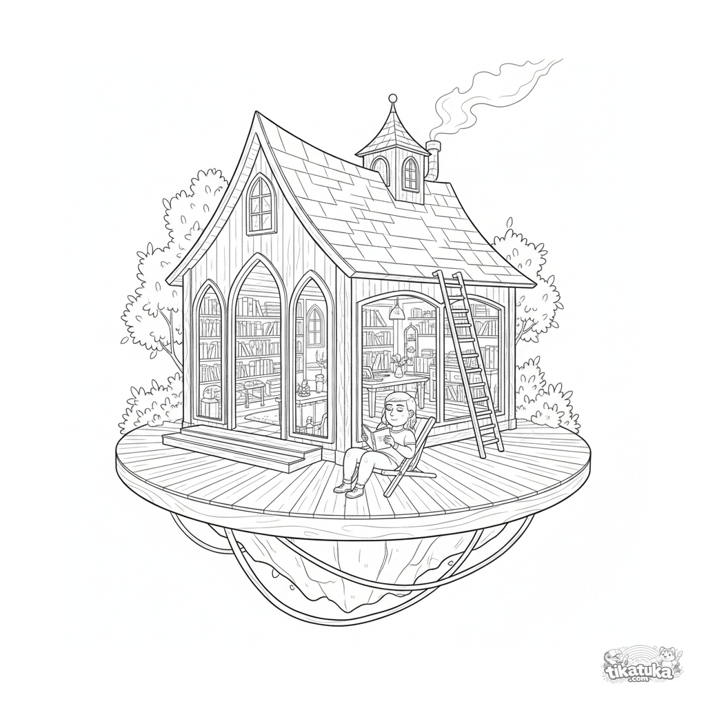 Página para colorir para 10-12 anos: uma biblioteca flutuante aconchegante com janelas e telhado inclinado em uma plataforma no mar. Uma pessoa lê em uma cadeira de deck, uma escada leva a uma cúpula de observação.