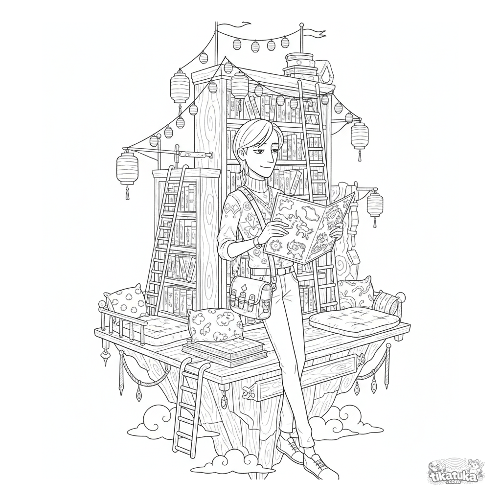 Página para colorir para 10-12 anos: uma aconchegante plataforma de biblioteca flutuante no mar, cheia de estantes, escadas, lanternas de papel e um visitante a folhear livros.