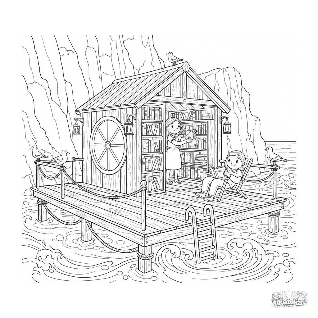 Página para colorir para 10-12 anos: uma biblioteca flutuante aconchegante em uma plataforma de madeira no mar. Cena detalhada com bibliotecário, leitor, livros e penhascos marinhos.