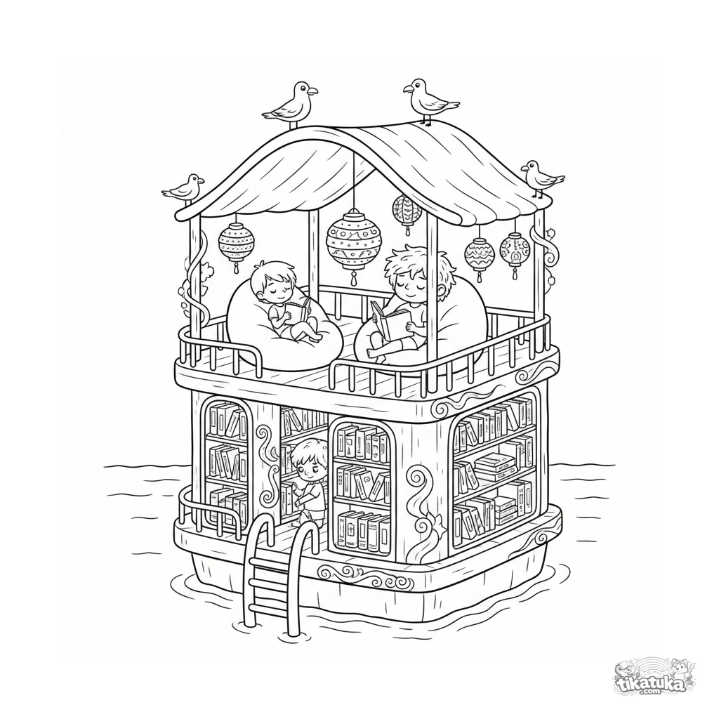 Página para colorir para 10-12 anos: uma biblioteca flutuante aconchegante em uma plataforma no mar. Prateleiras de livros, cantinho de leitura, lanternas e escada. Cena detalhada e pacífica.
