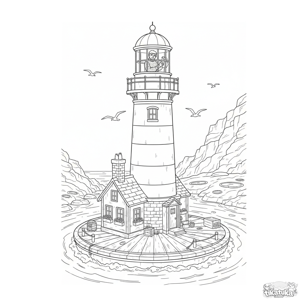 Página para colorir para crianças de 10 a 12 anos: um farol flutuante detalhado com casa do guardião em uma plataforma circular em uma enseada rochosa. Guardião, gaivotas, ondas e detalhes arquitetônicos.