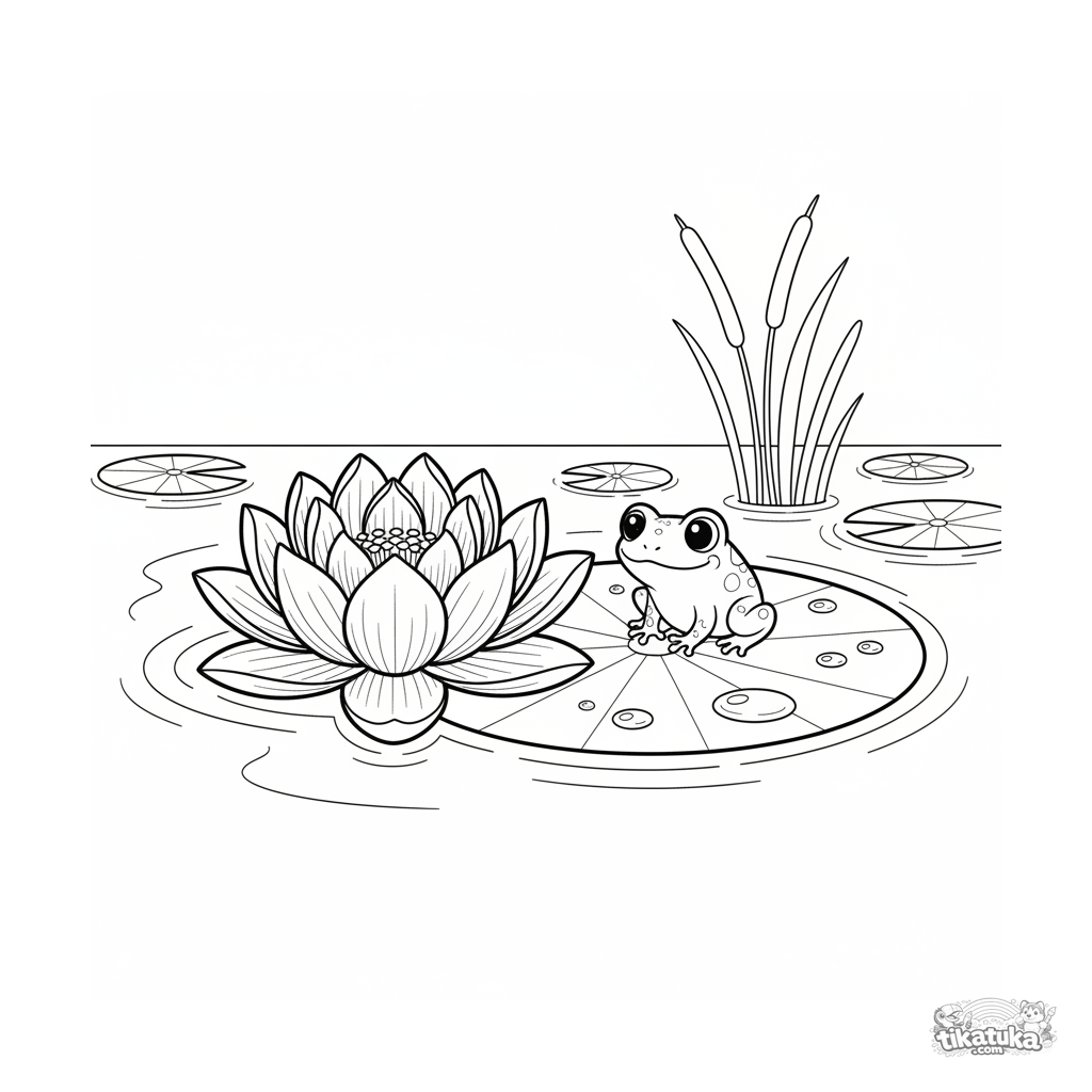 Página para colorir de uma flor de lótus flutuando em um lago calmo para 7-9 anos. Estilo esboço aquarela, sapo em uma folha, ondulações na água.