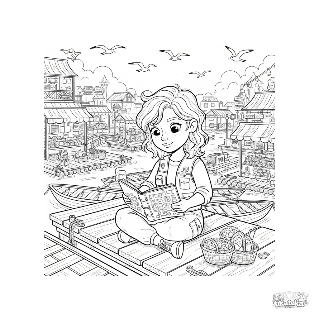 Página para colorir para 10-12 anos: um arquiteto a esboçar planos numa movimentada plataforma de mercado flutuante no mar. Cena detalhada com barcos, barracas e pássaros.