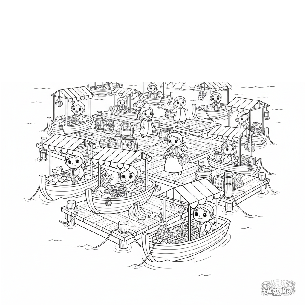 Página para colorir: um movimentado mercado flutuante em plataformas de madeira no mar para crianças de 10-12 anos. Cena detalhada com barcos, barracas, compradores e um farol distante.