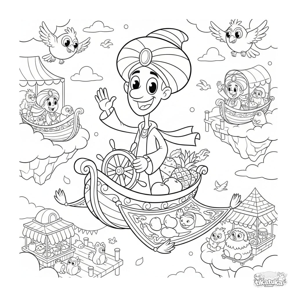 Página para colorir divertida para crianças 4-6: um comerciante em um barco de tapete voador vende mercadorias em um mercado flutuante nas nuvens. Estilo cartoon anos 90.