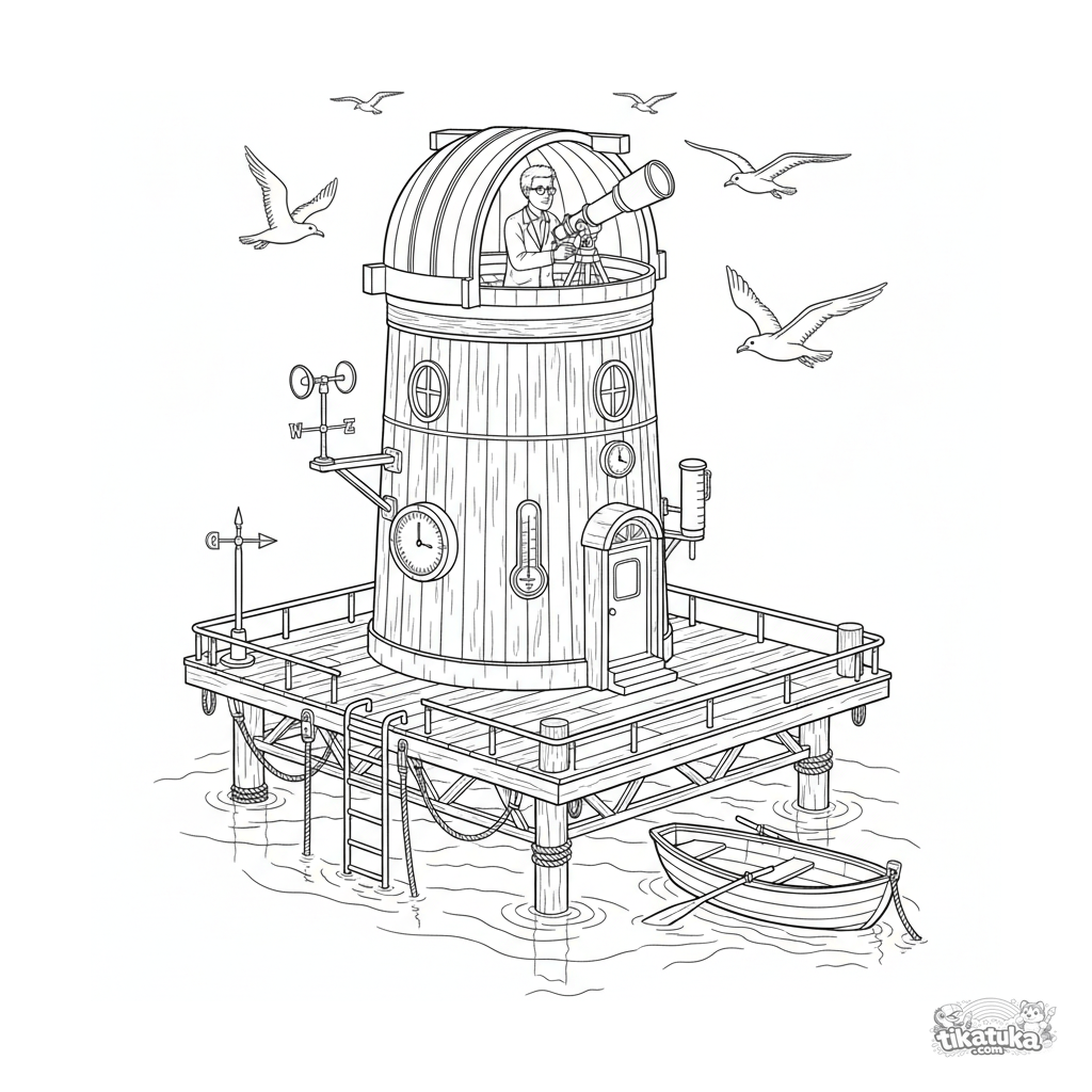 Página para colorir para 10-12 anos: um observatório flutuante detalhado com cúpula e instrumentos em uma plataforma de madeira no mar. Um cientista ajusta um telescópio, pássaros voam ao redor.