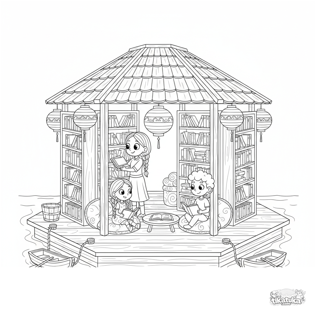 Página para colorir detalhada para crianças de 10 a 12 anos: uma biblioteca flutuante aconchegante em uma plataforma hexagonal em uma baía calma. Estantes de livros, leitores, bibliotecária e lanternas decorativas.