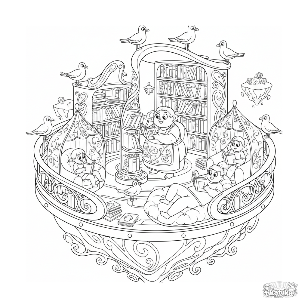 Página para colorir de uma biblioteca flutuante ao ar livre para 10-12 anos. Cena detalhada com estantes de livros, leitores e toldos.