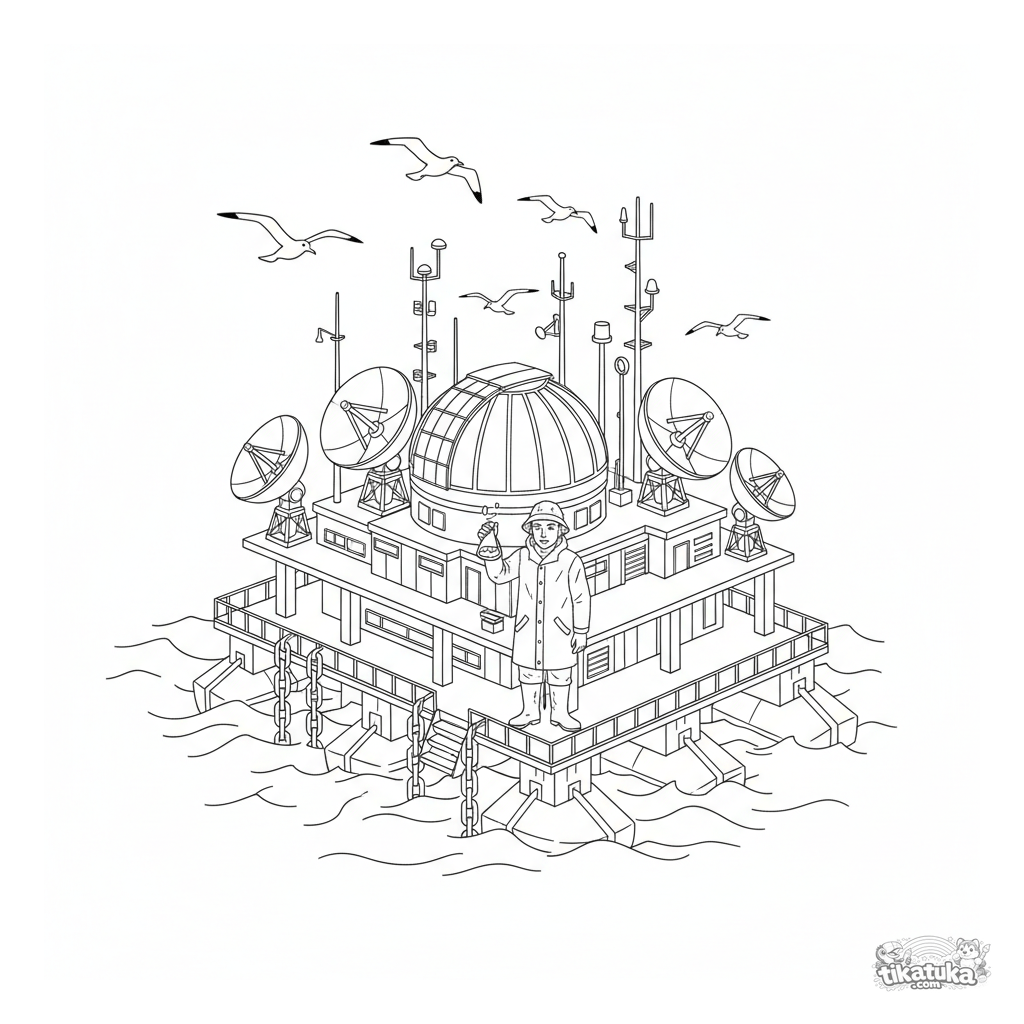 Página para colorir para crianças de 10-12 anos: uma plataforma de pesquisa marinha flutuante detalhada com observatório, antenas e um cientista. Cena complexa para colorir criativamente.