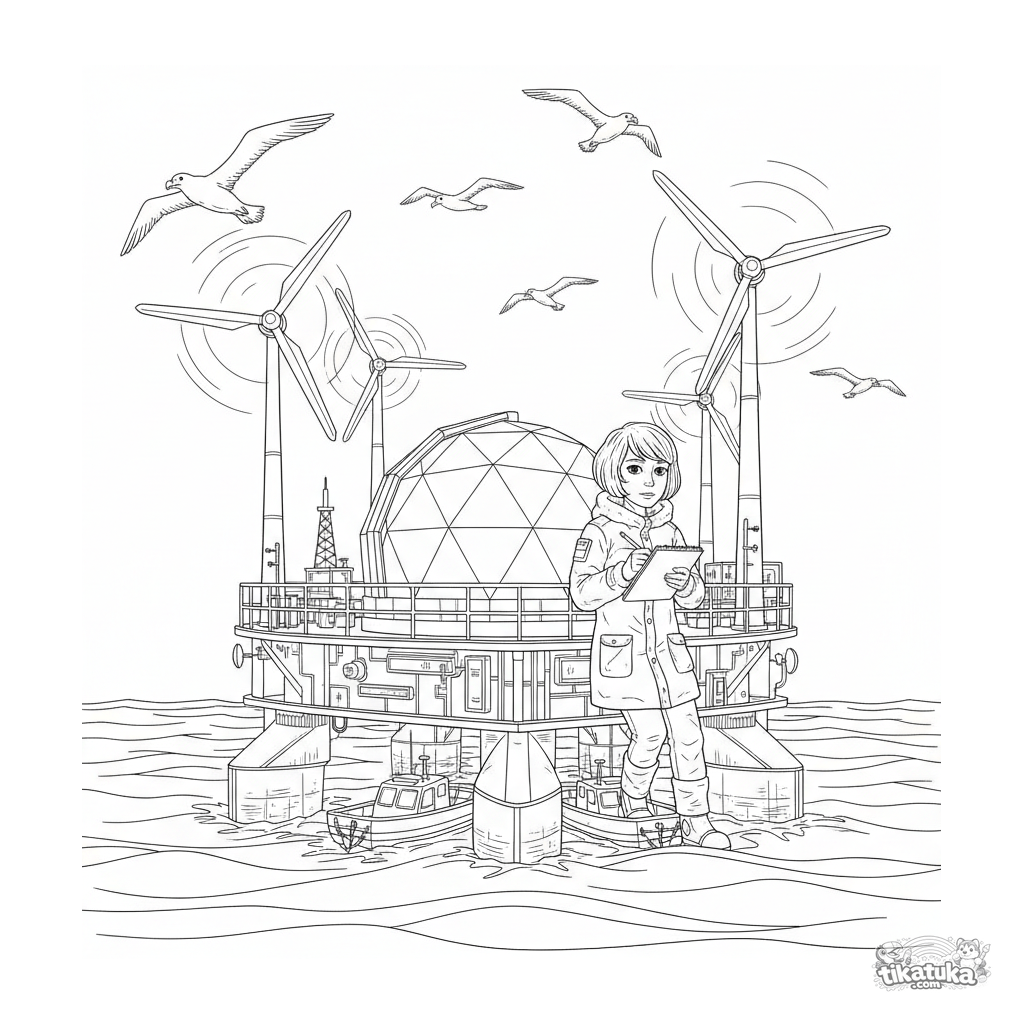 Página para colorir para crianças 10-12: uma plataforma de pesquisa flutuante detalhada no mar com um observatório em cúpula e turbinas eólicas. Um cientista faz anotações.