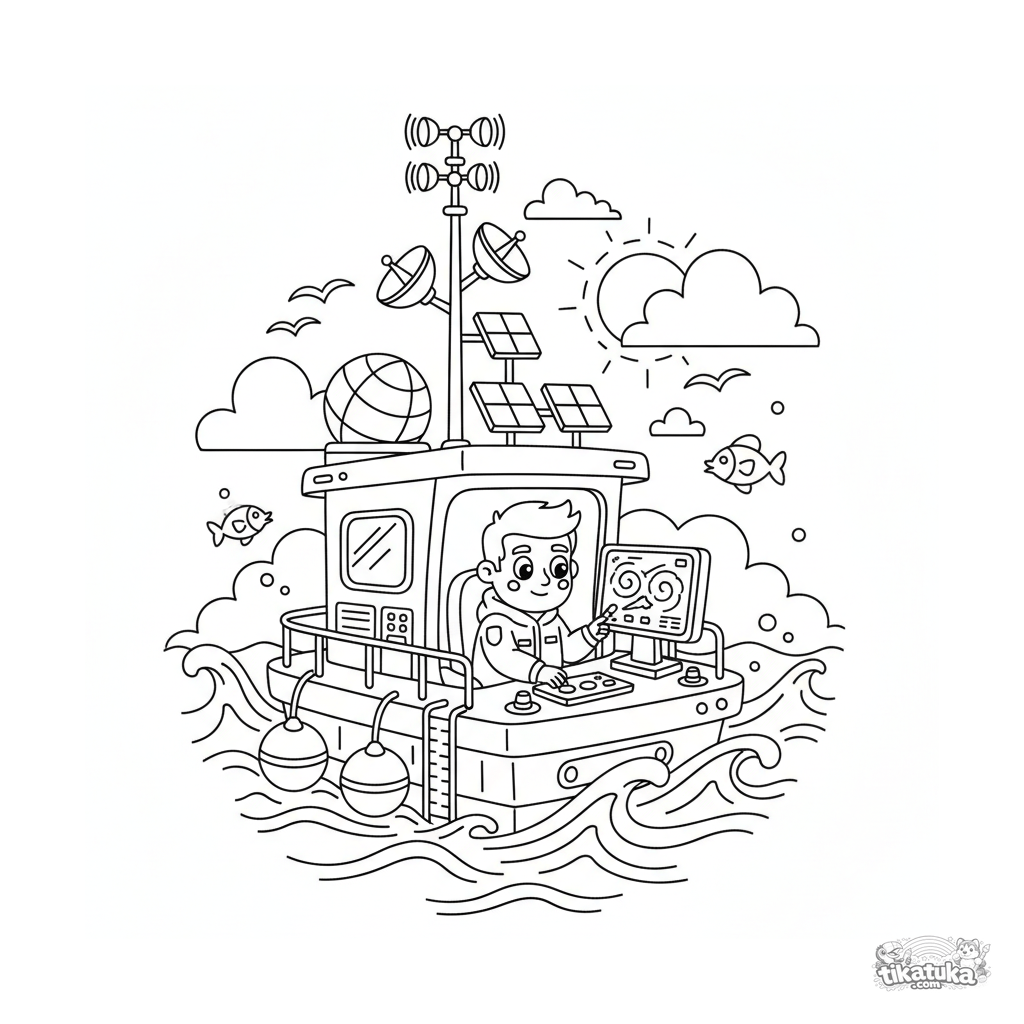 Página para colorir para 10-12 anos: uma estação meteorológica flutuante detalhada com mastros de instrumentos, painéis solares e um meteorologista monitorando uma tempestade.