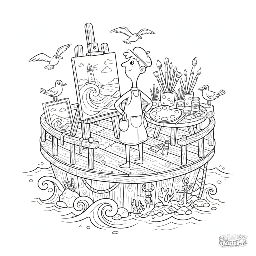 Página para colorir da oficina flutuante de um artista no mar para 10-12 anos. Cena detalhada com cavalete, tintas e telas.