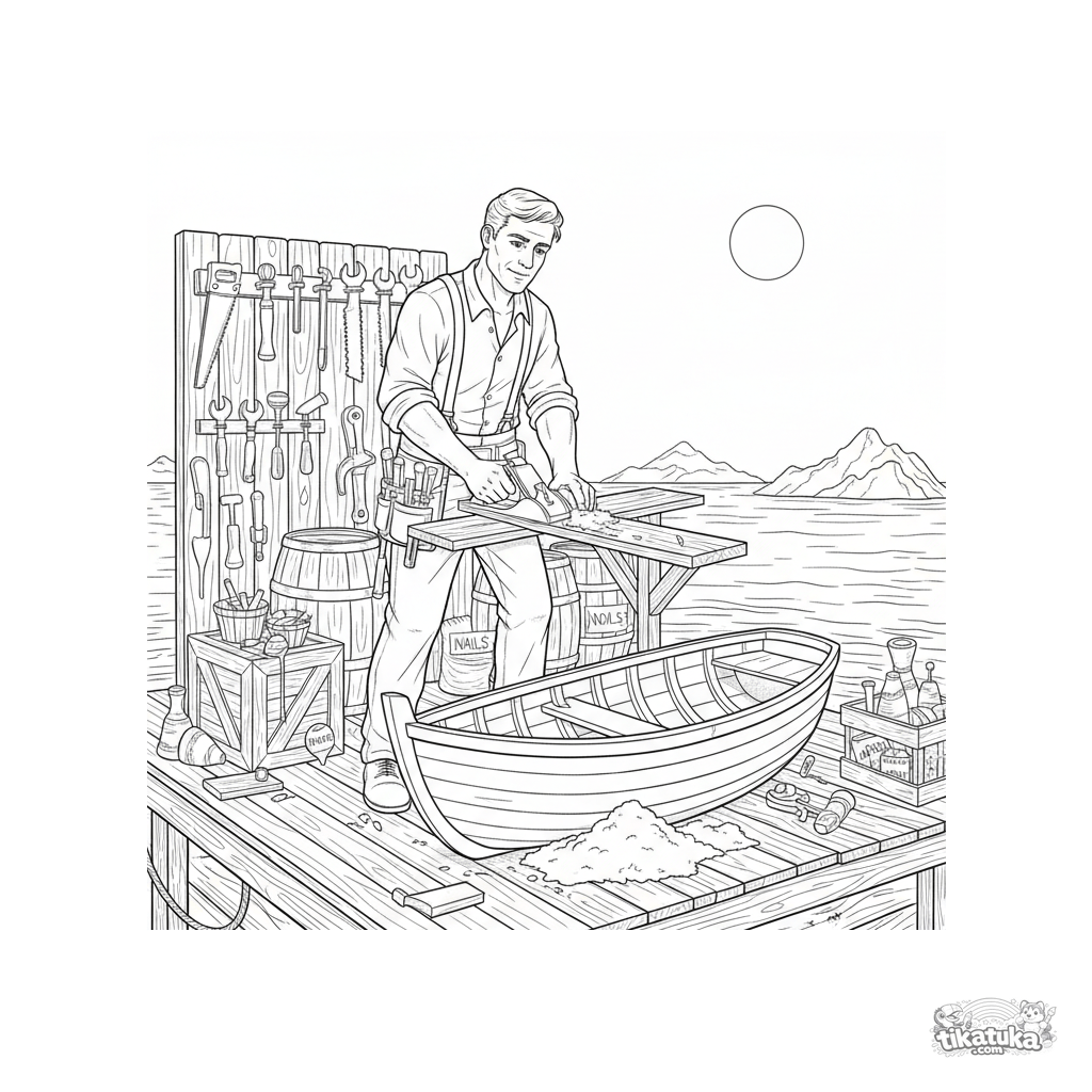 Página para colorir detalhada para 10-12 anos: um carpinteiro a construir um pequeno barco numa plataforma flutuante de oficina no mar, rodeado de ferramentas, serradura e barris.