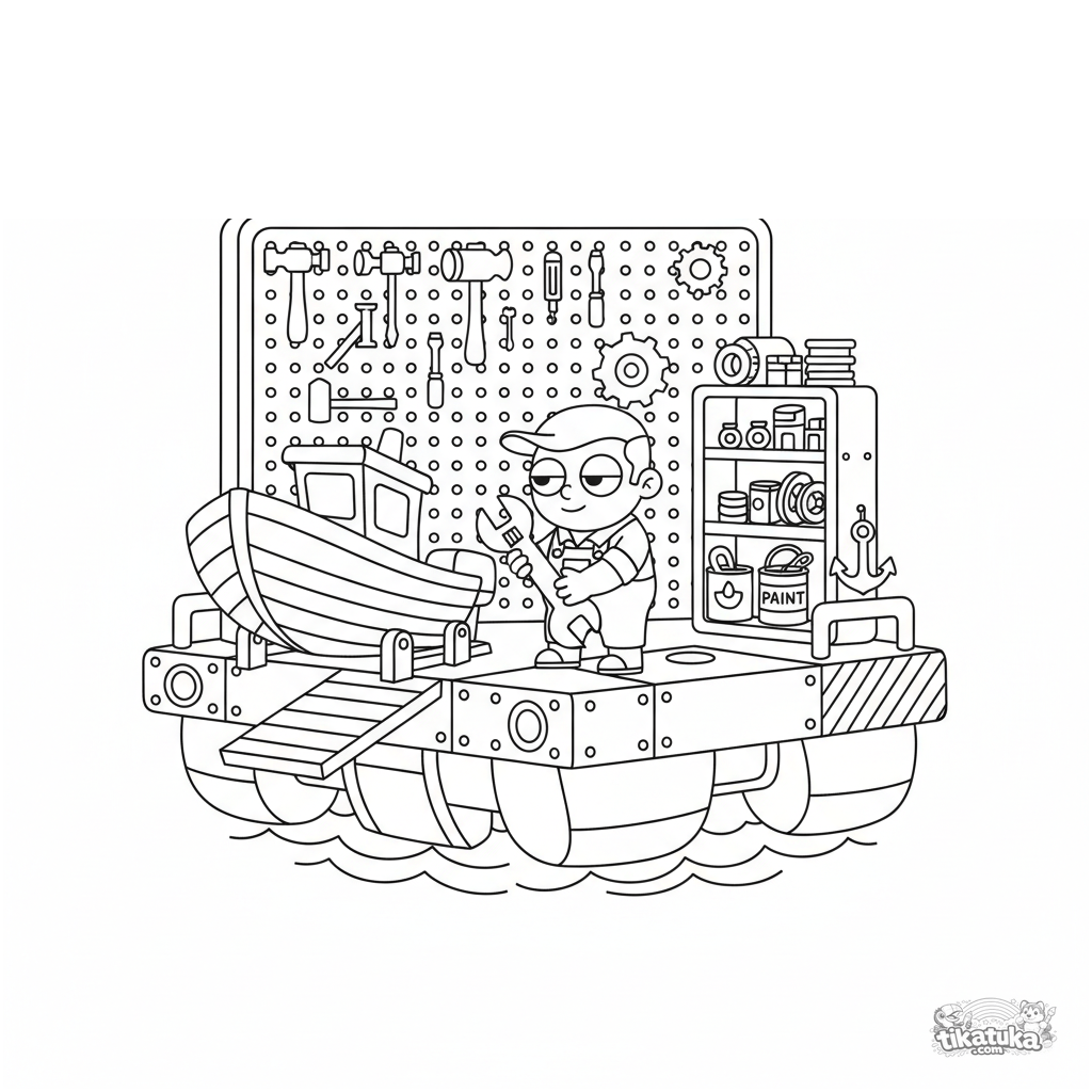 Página para colorir geométrica de uma oficina flutuante de reparo de barcos em uma plataforma marinha para 10-12 anos. Um mecânico trabalha com ferramentas, um barco está em uma rampa.