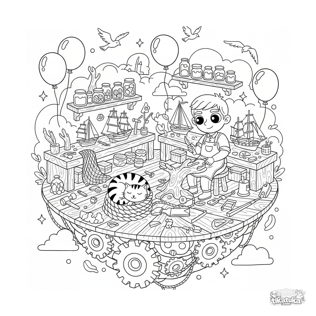 Página para colorir para 10-12 anos: uma oficina flutuante criativa em uma plataforma marinha. Detalhes abundantes com ferramentas, modelos de navios, artesão trabalhando e gato dormindo.