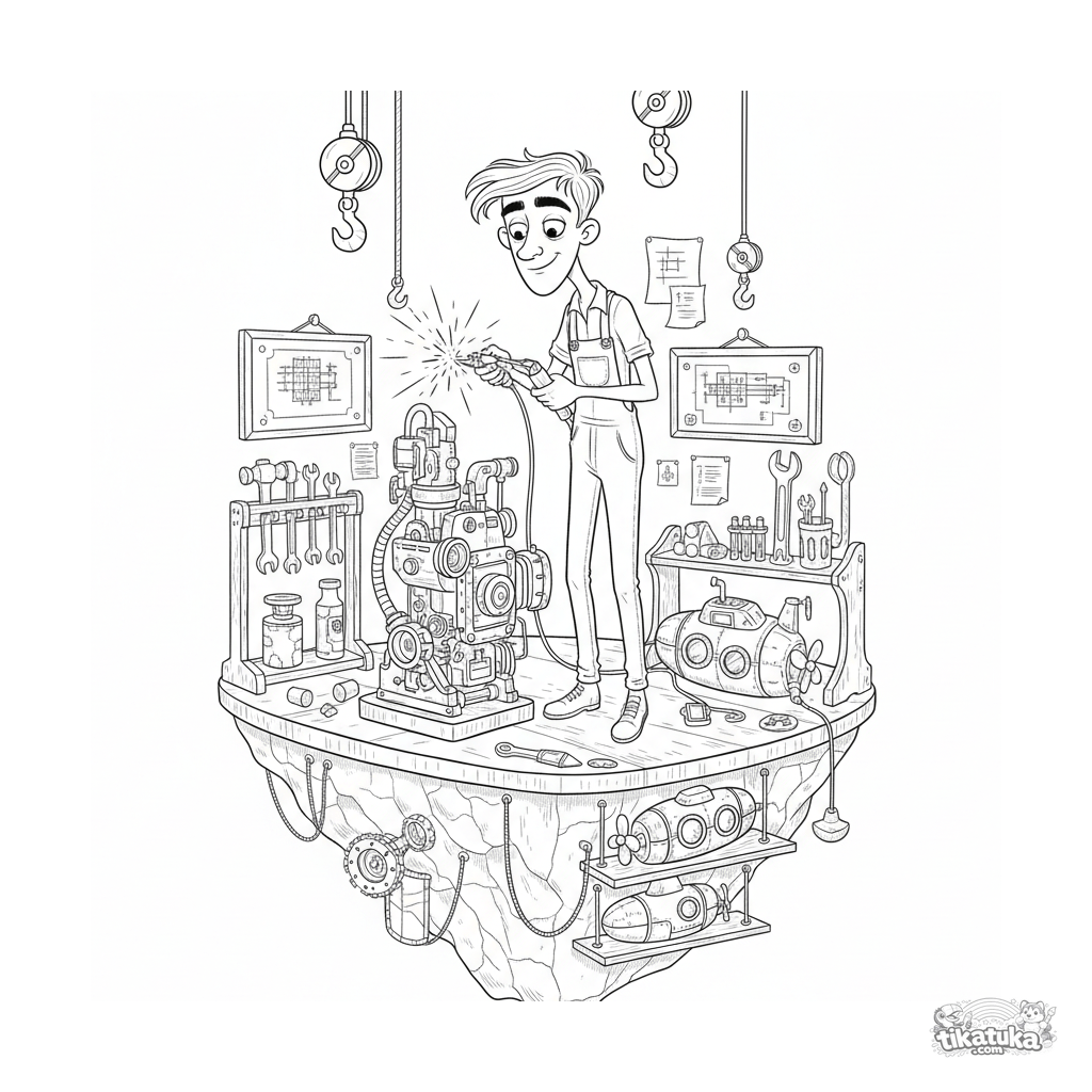 Página para colorir para 10-12 anos: um engenheiro trabalha em uma oficina flutuante no mar. Cena complexa com máquinas, plantas, ferramentas e faíscas de solda.