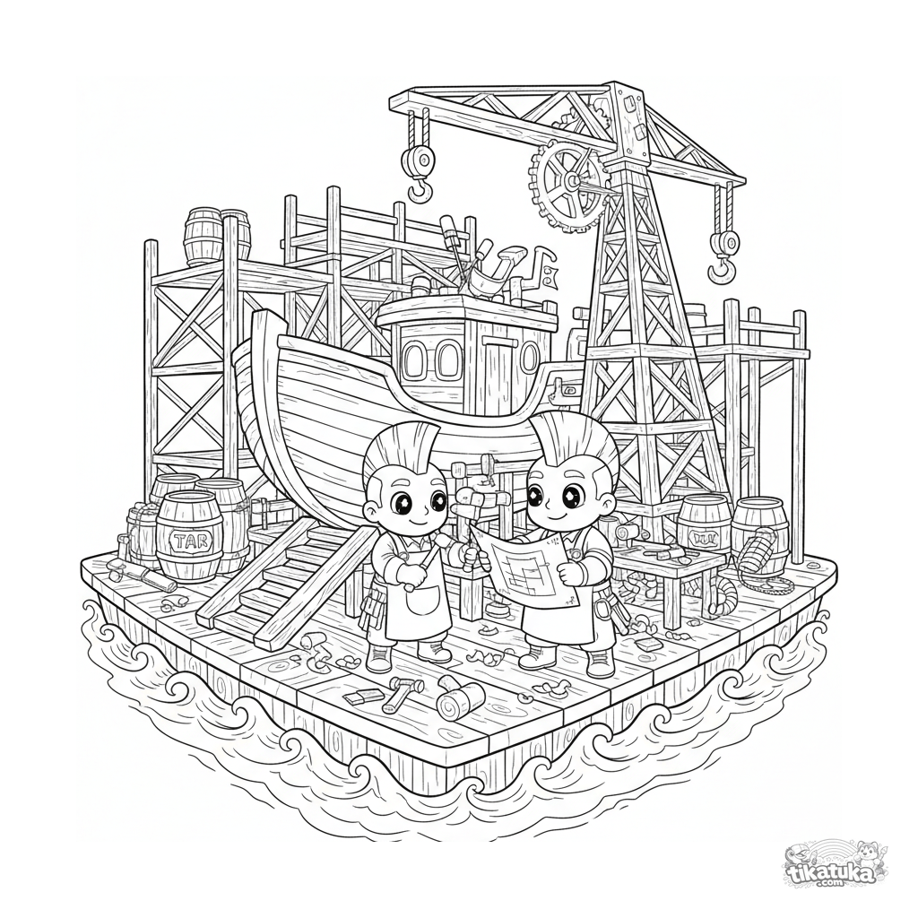 Página para colorir para crianças 10-12: uma plataforma de estaleiro e oficina flutuante. Um casco de barco é construído em uma rampa, com guindaste e carpinteiros navais.