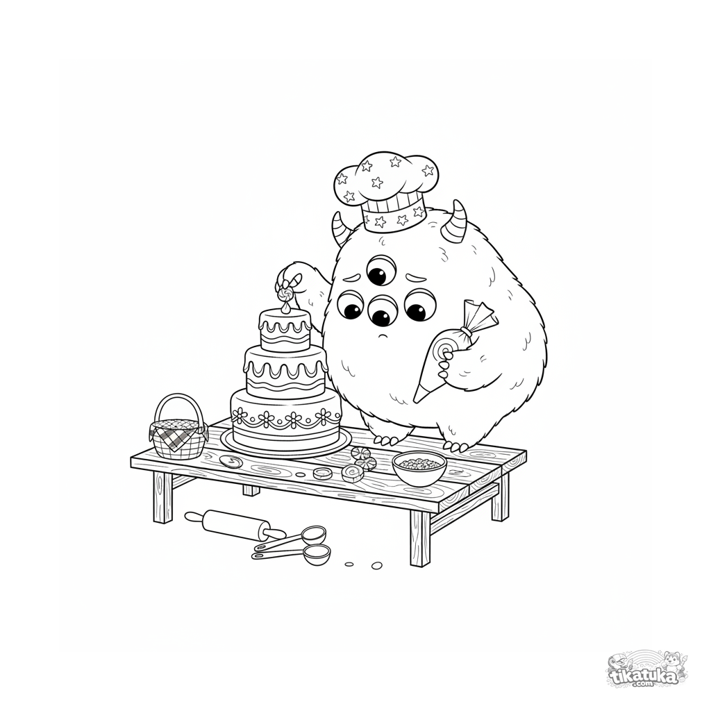 Página detalhada para colorir para crianças de 10-12 anos: um monstro confeiteiro fofinho decorando um bolo em uma mesa de piquenique. Muitos elementos para colorir.