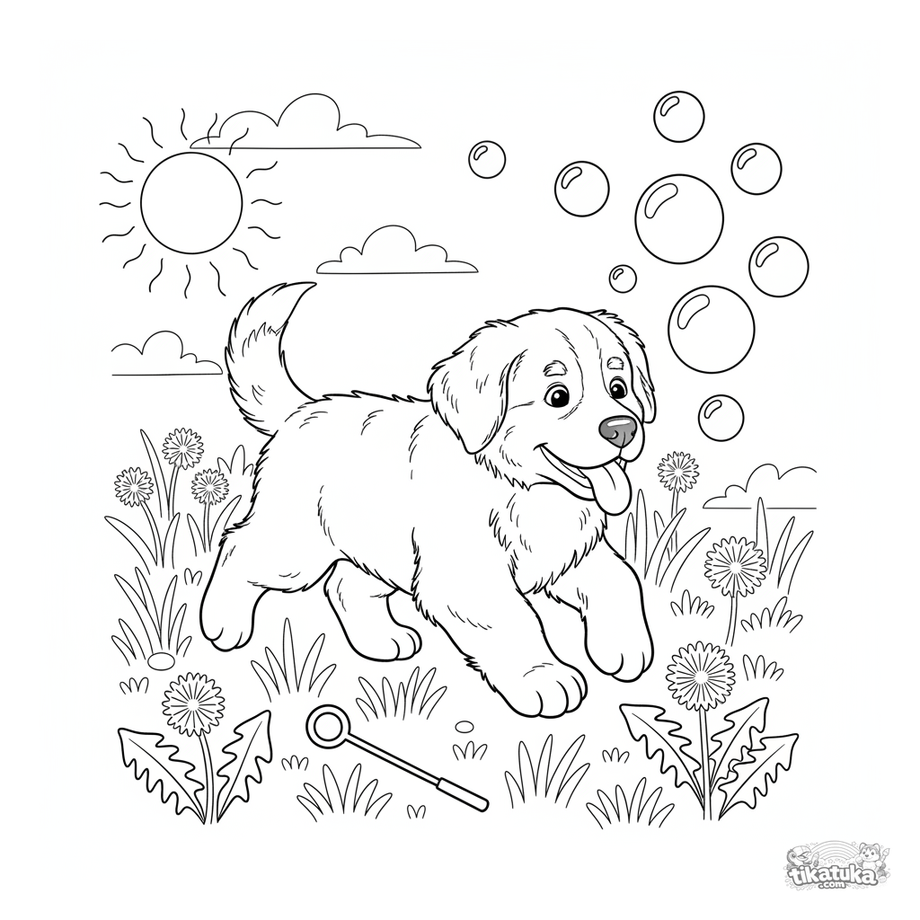 Página para colorir de um filhote fofo de Cão da Montanha Bernês perseguindo bolhas de sabão em um prado. Para crianças de 3 a 6 anos.