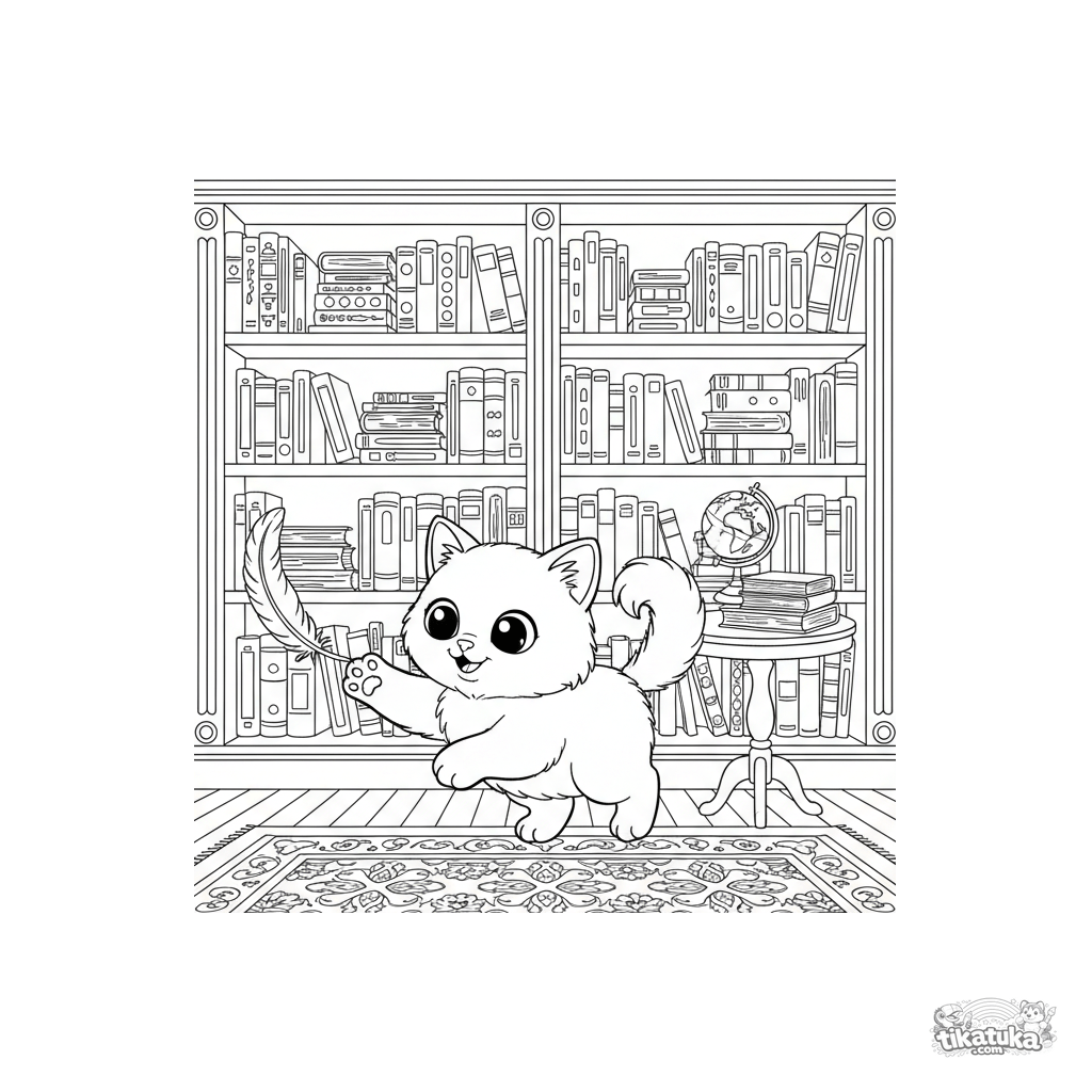 Página para colorir de um fofo gatinho Birmanês brincando com uma pena em uma biblioteca vitoriana. Para crianças de 3 a 6 anos.