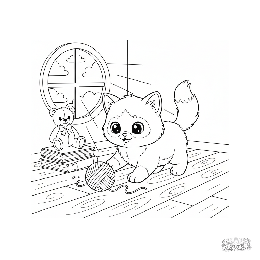 Página para colorir de um gatinho birmanês fofinho perseguindo um novelo de fio em um sótão ensolarado. Para crianças de 4-6 anos.