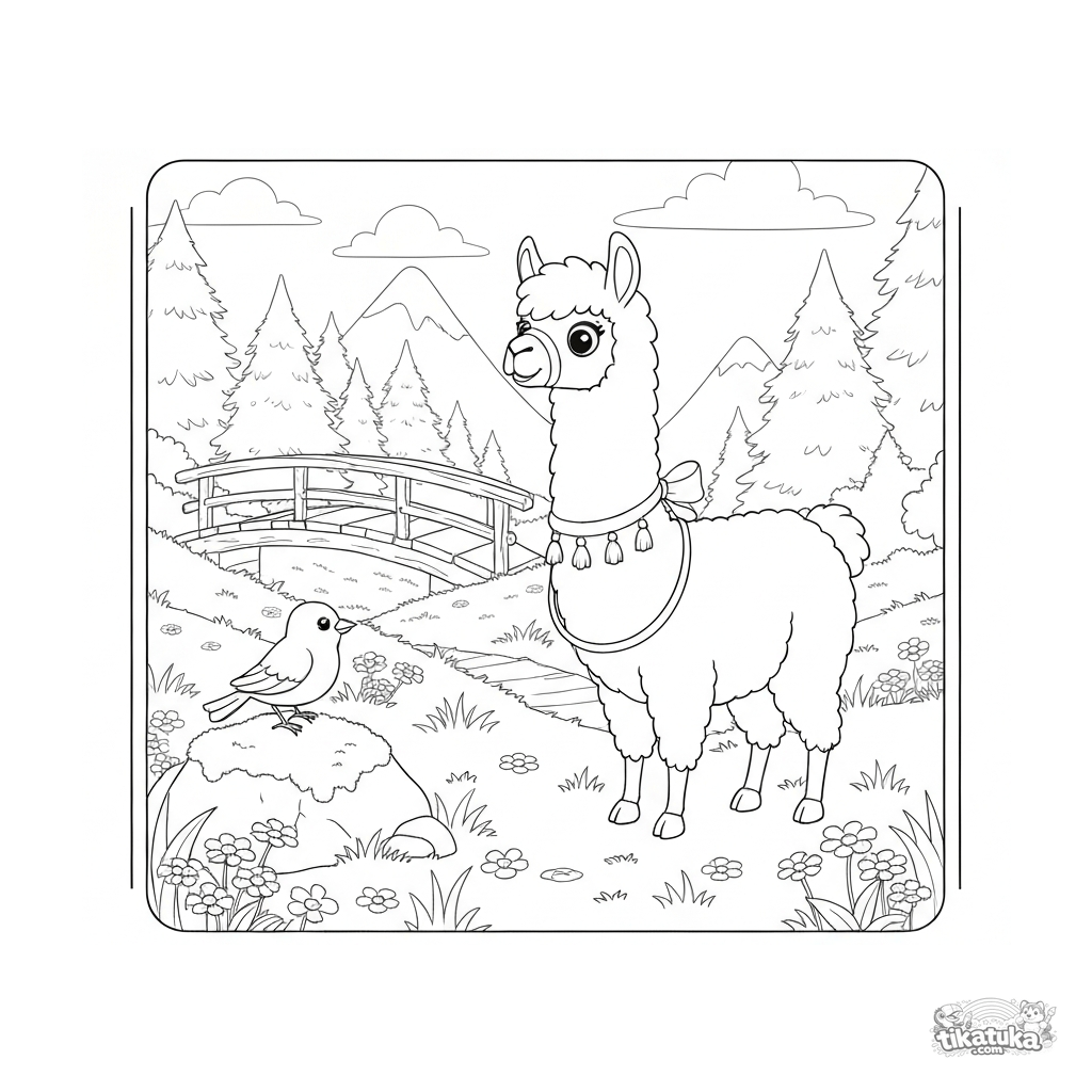 Página para colorir de uma lama fofinha em um prado montanhoso. Para crianças de 5 a 8 anos. Inclui um pássaro, uma ponte e flores silvestres.