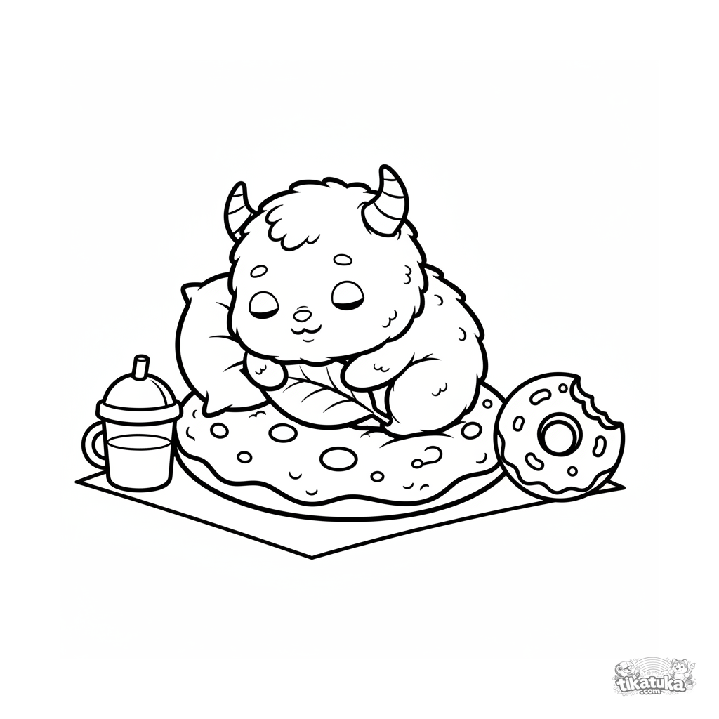Página simples para colorir para crianças pequenas de 2-3 anos: um bebê monstro fofinho dormindo em um biscoito grande em um piquenique. Formas grandes, mínimo detalhe.