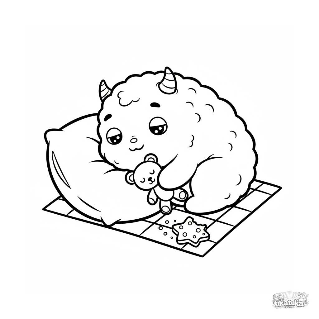 Página simples para colorir para crianças pequenas: um bebê monstro fofinho dormindo em um travesseiro de algodão-doce em um piquenique. Formas grandes, margens amplas. Para 2-3 anos.