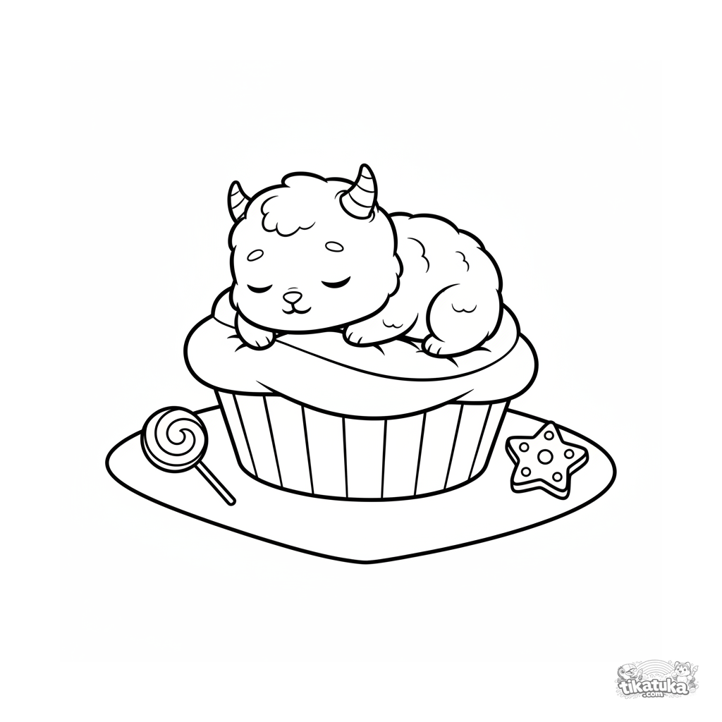 Página simples para colorir para crianças de 2-3 anos: um bebê monstro fofinho dormindo em um cupcake gigante em um piquenique. Formas grandes, poucos detalhes.