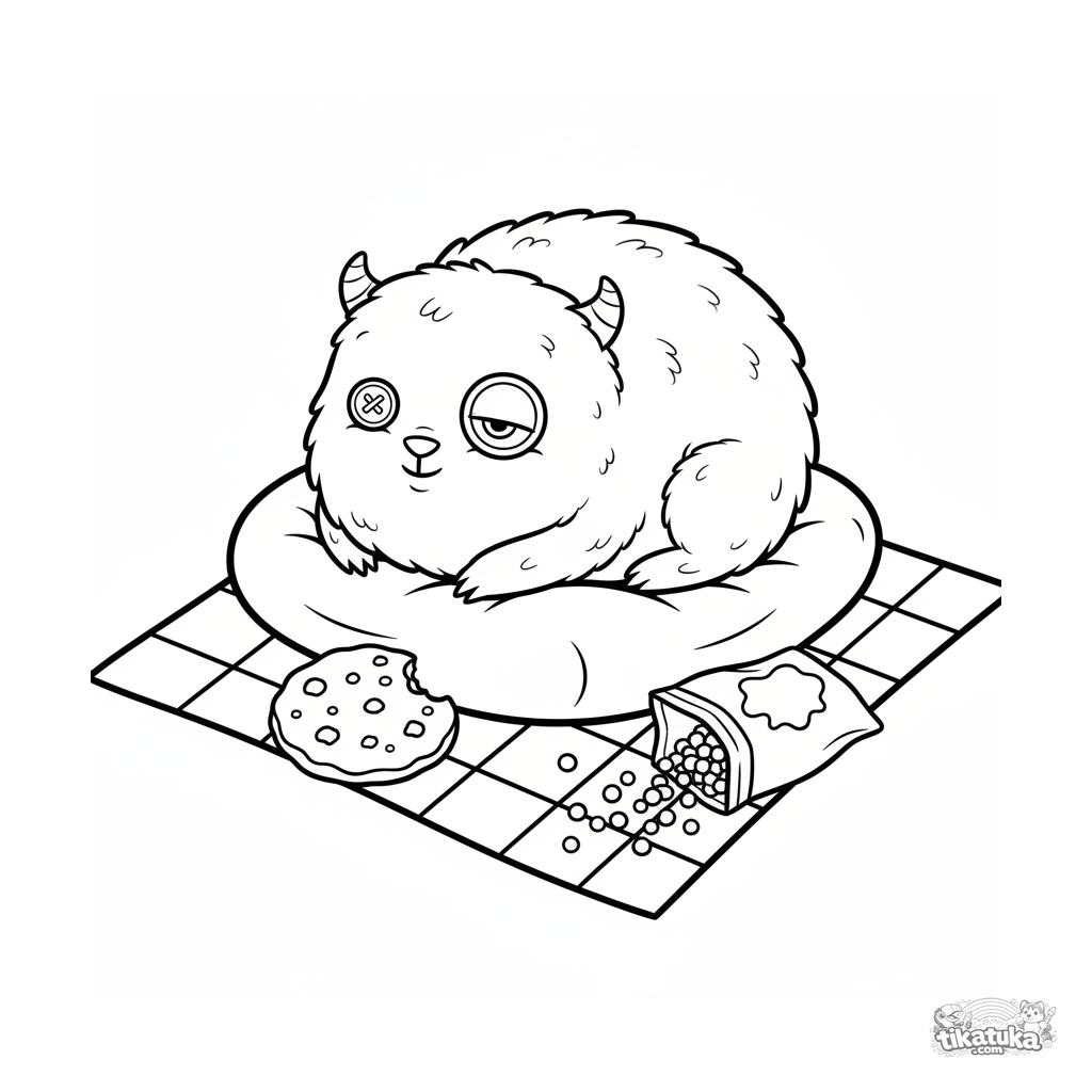 Página para colorir para bebês 2-3: um monstro fofinho cochilando em um travesseiro de marshmallow depois de um piquenique. Formas grandes e simples.