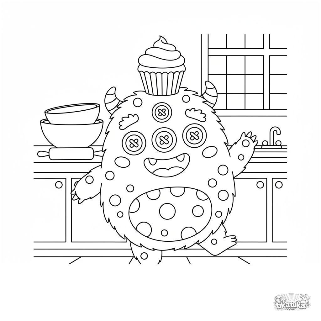 Página para colorir para crianças 4-6: um monstro fofinho com três olhos dança feliz com um bolinho na cabeça em uma cozinha minúscula. Cena divertida para colorir.