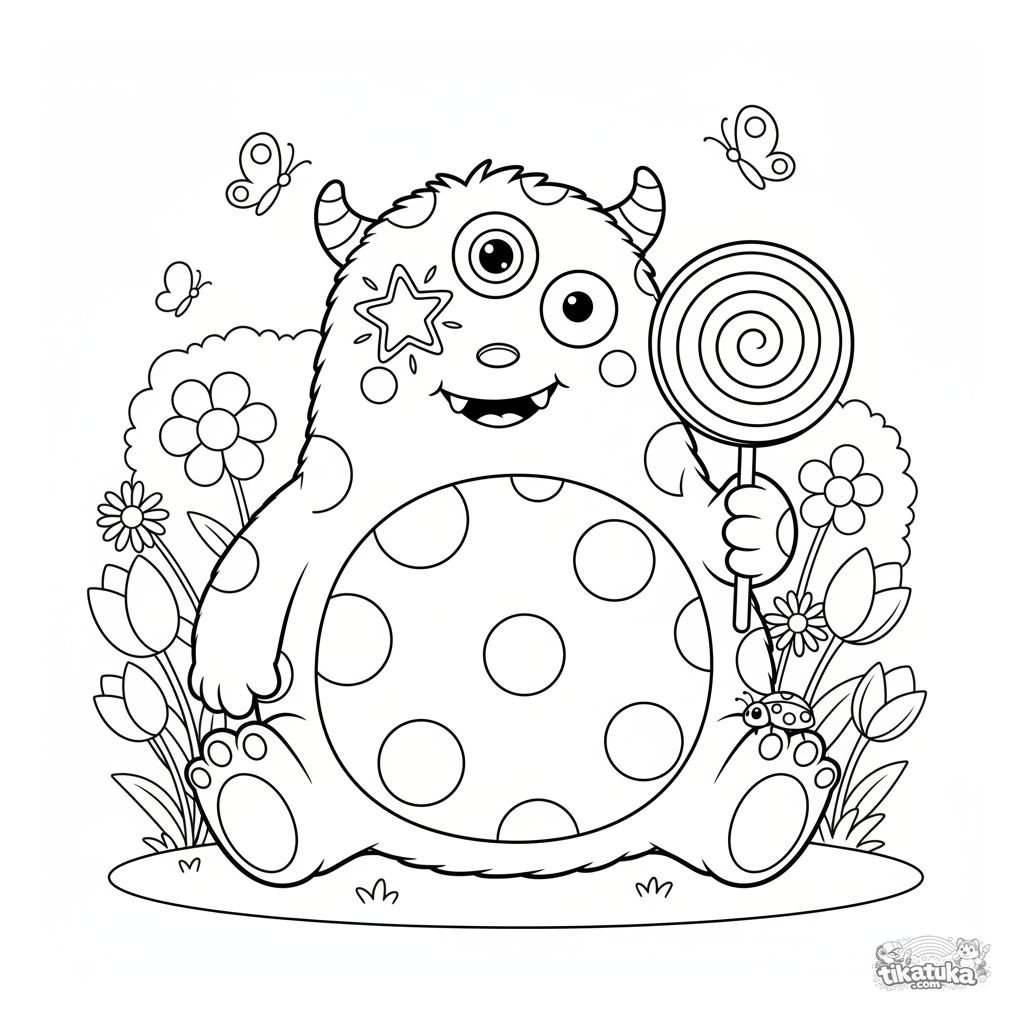 Página para colorir para crianças: um monstro fofinho com três olhos diferentes segura um pirulito em um jardim de flores. Cena divertida e colorida.
