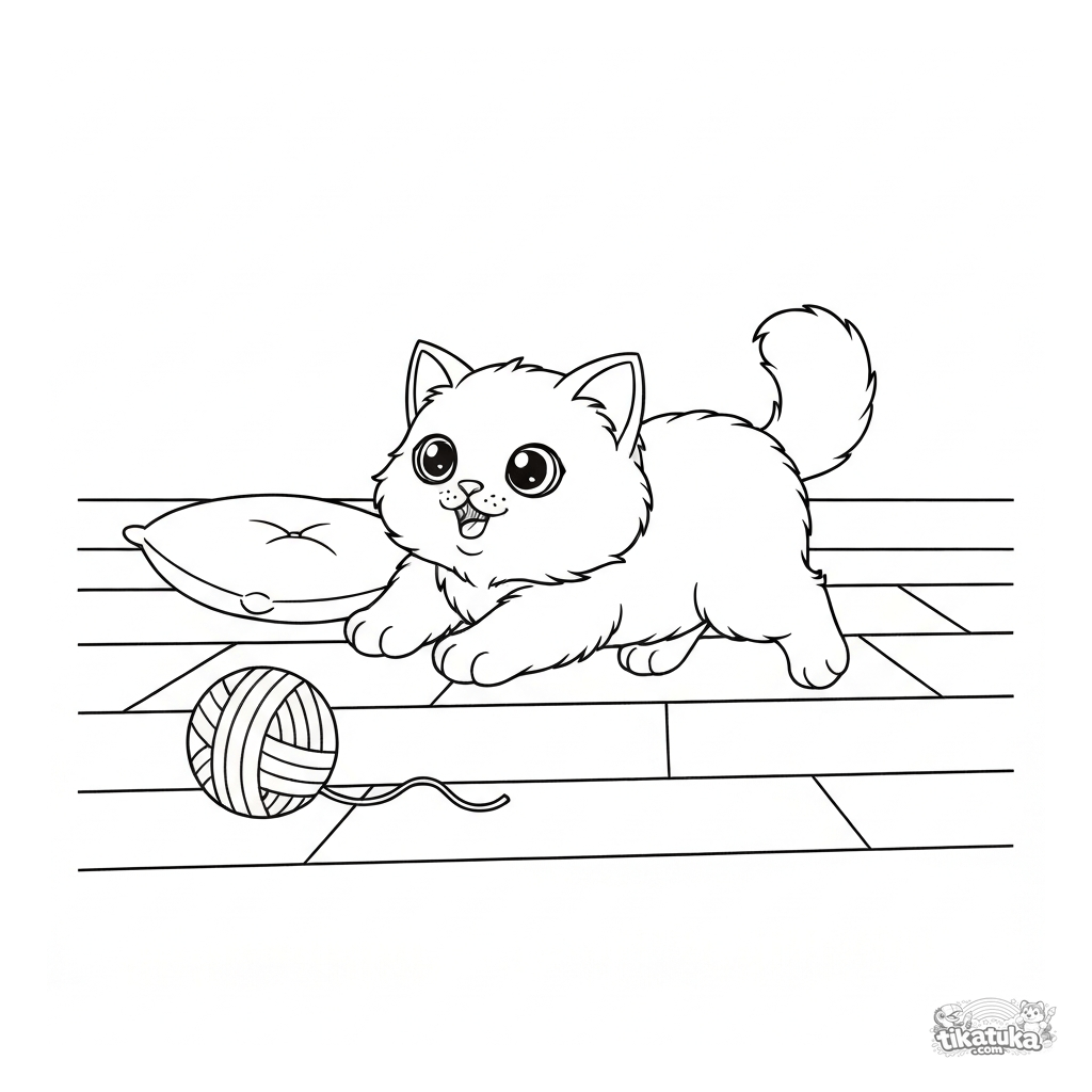 Página para colorir para bebês: um gatinho fofinho persegue um novelo. Formas simples e margens amplas para crianças de 2-4 anos.