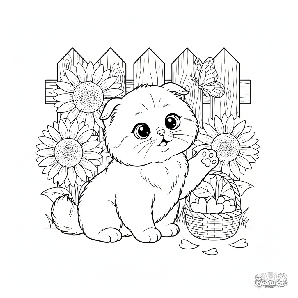 Página para colorir de um gatinho fofo e fofinho brincando com uma borboleta entre girassóis. Para crianças de 3 a 6 anos. Linhas simples.