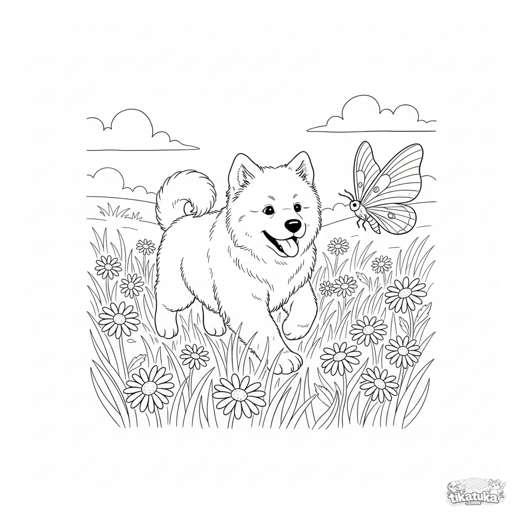 Página para colorir de um filhote de Samoieda fofinho perseguindo feliz uma mariposa em um prado de verão. Para crianças de 4 a 6 anos.