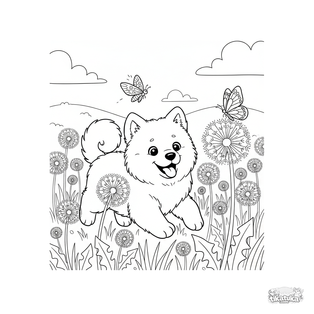 Página para colorir de um filhote de Samoieda fofo perseguindo felizmente uma mariposa em um prado de dentes-de-leão. Para crianças de 4 a 6 anos.