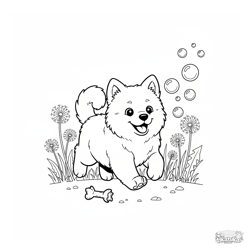 Página para colorir de um filhote de Samoieda fofinho perseguindo bolhas em um campo de dentes-de-leão. Para crianças de 3 a 6 anos.