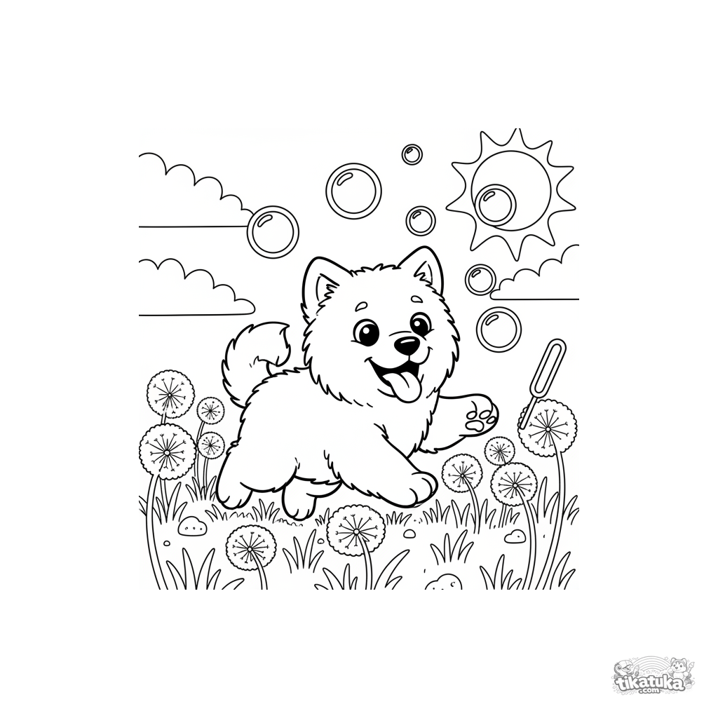 Página para colorir de um filhote de Samoieda fofo perseguindo bolhas de sabão em um campo de dentes-de-leão. Para crianças de 3-6 anos.
