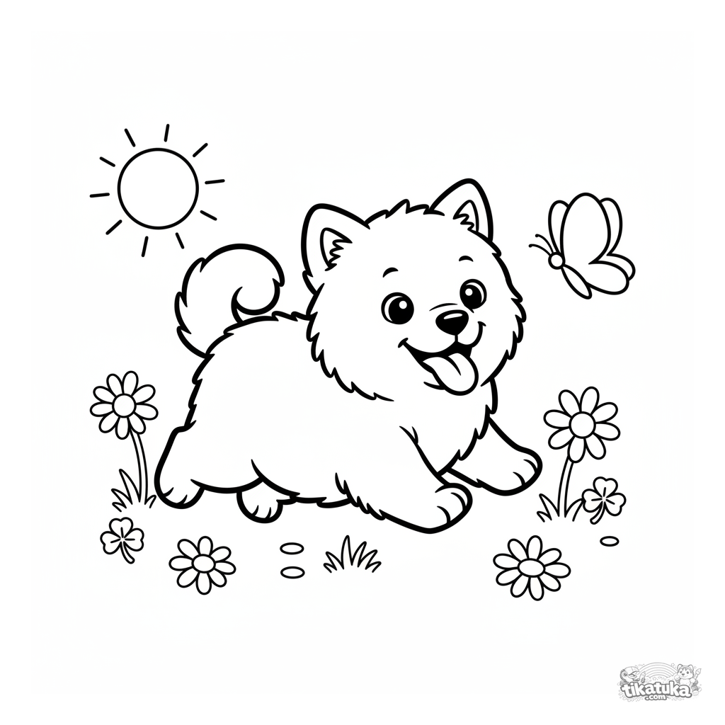 Página para colorir para crianças pequenas: um filhote de Samoieda fofo persegue feliz uma borboleta em um campo. Formas simples e grandes perfeitas para crianças de 2-3 anos.